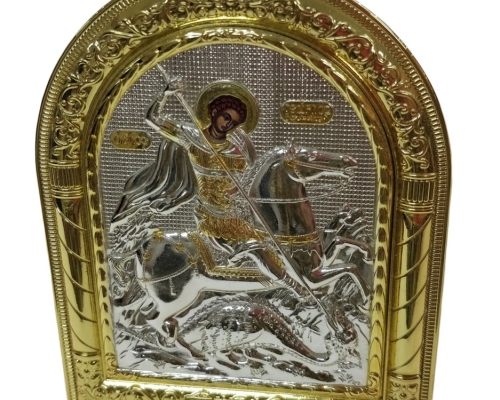 Ікона вмч. Георгія Побідоносця виготовлена з металу за допомогою технології тиснення на станку, що надає їй об'ємності та виразності. Кожна деталь ікони виконана з уважністю та деталізацією. Металева основа надає іконі міцності та довговічності.