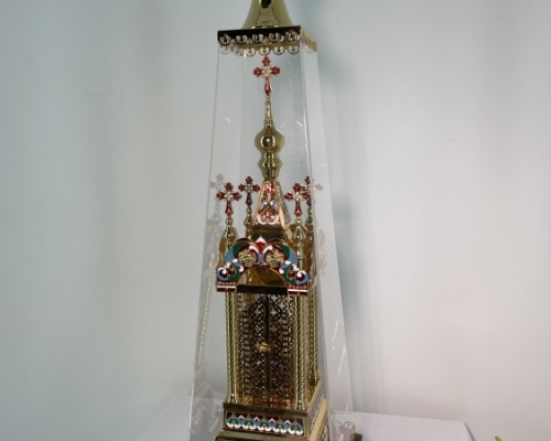 Ця вишукана дарохранительниця виконана у формі церкви з колонами та відкриваючими дверцятами. Її дизайн прикрашений ювелірними вставками, які розписані гарячими емалями, а декоративні візерунки виконані за допомогою лазерної різки. Завдяки золотому покриттю, виріб має багатий та елегантний вигляд.