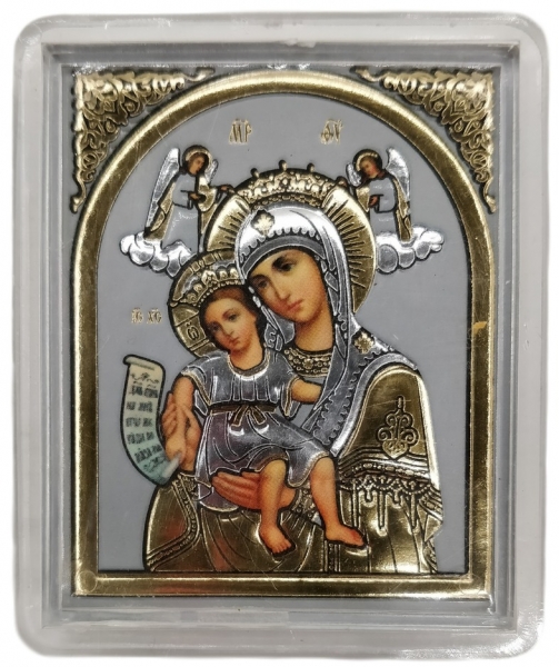 Ікона з золотим і срібним тисненням, в органічному склі, що надає прозорість та особливу красу. Має підставку та липучку