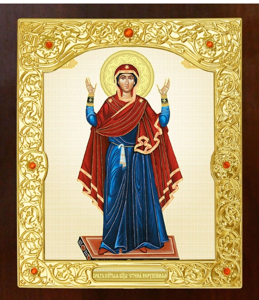 Ікона Богородиці: "Непорушна Стіна" рамка виготовлена з дерев'яної основи. Оклад ікони виконаний з пластику з орнаментом, також оклад оздоблений червоними камінчиками. Друк літографії на папері, це дає змогу передати деталі зображення з великою точністю та яскравістю. Розмір: 18х21 см