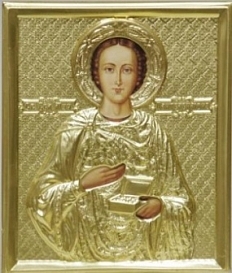 Ікона вмч. Пантелеімона виготовлена на дерев'яній основі з тонким о'бємним шаром металу, що вилитий литвом, який покривається імітацією штучного золота Розмір 11х13