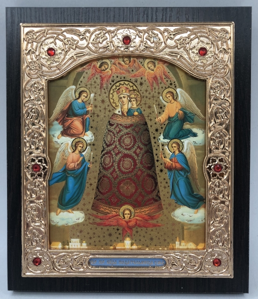 Ікона Богородиці "Подавниця розуму" рамка виготовлена з дерев'яної основи. Оклад ікони виконаний з пластику з орнаментом, також оклад оздоблений червоними камінчиками. Друк літографії на папері.