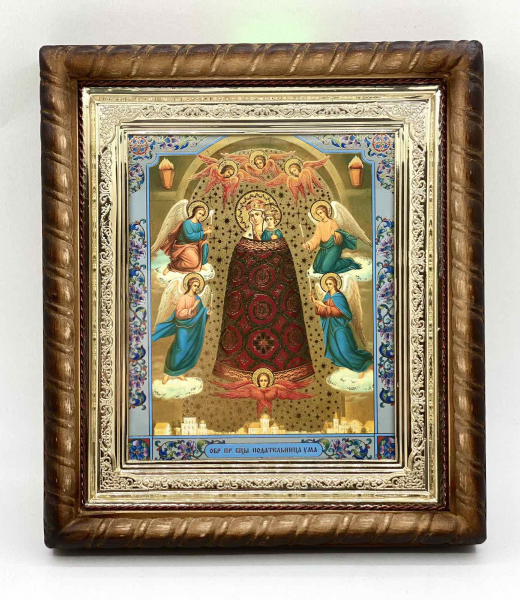 Ікона Богородиці "Подавниця розуму" на дерев'яній основі має фігурну форму у вигляді косички, підрамник із пластику з напиленням золотистої фарби, літографія має тиснення на папері.