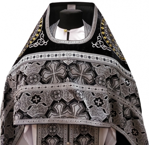 Облачення священника комбіноване, основа з якісної парчевої тканини вітчизняного виробництва з подвійною металізацією, верх-вишитий золотою і срібною ниткою на бархаті виробництва Італії, декоровано вишитими хрестами, галуном та бахрамою. В комплект входить: фелон, єпітрахіль, поручі, палиця, набедренник, пояс та воздух з покровцями.