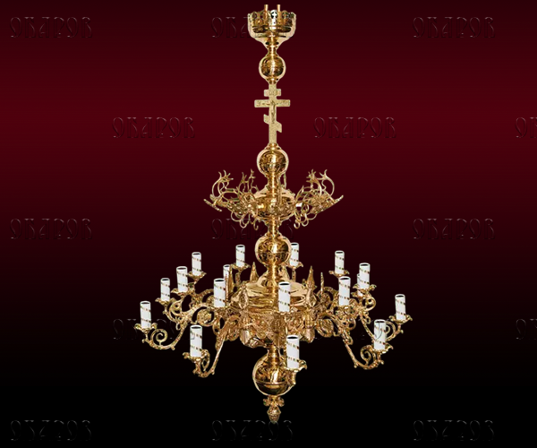 Одноярусне церковне панікадило з 9 гілками та 18 свічками виготовлене з високоякісного латунного сплаву. Для естетичної довершеності конструкція покрита шаром "під золото" та оздоблена декоративними елементами. Міцні підвісні деталі забезпечують надійність і витримують загальну вагу виробу.