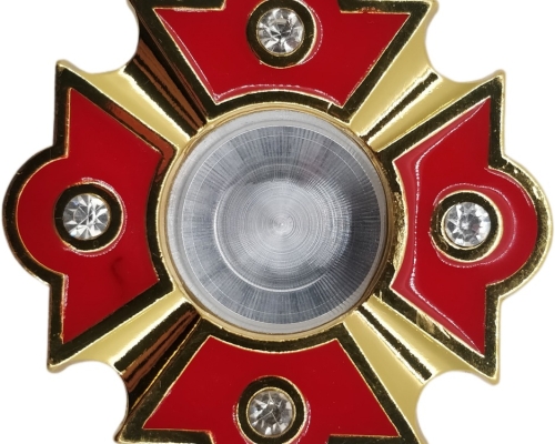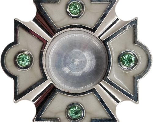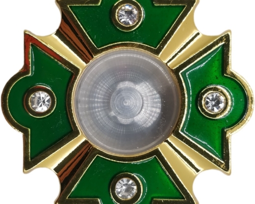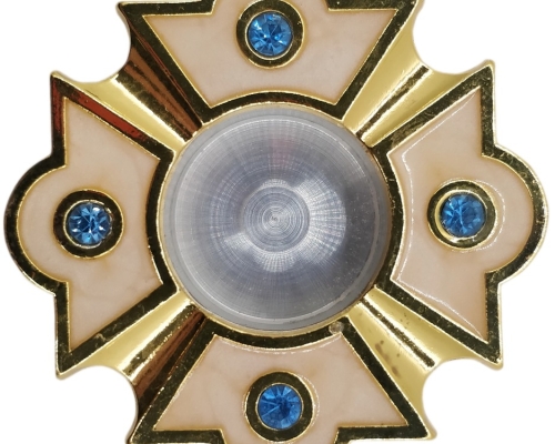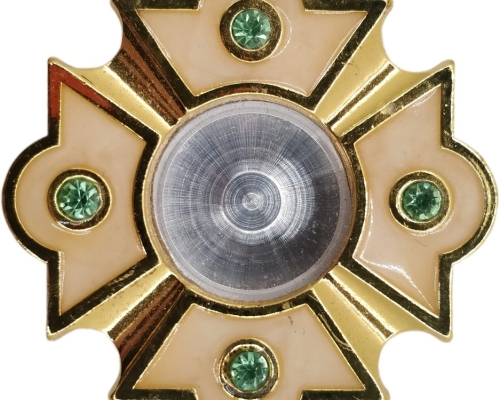 Латунний круглий золотистий мощевик всередині якого вмонтоване скло. Низ при потребі відкручується.