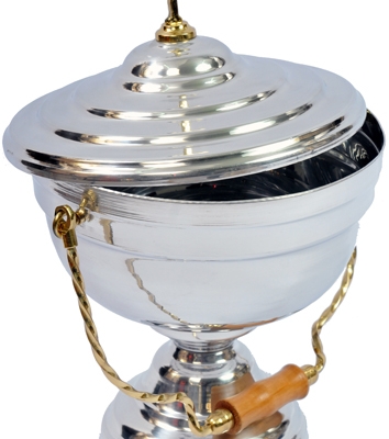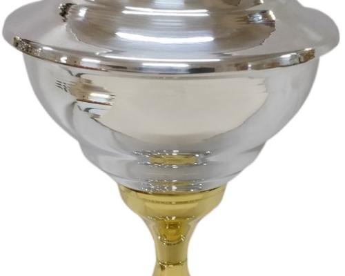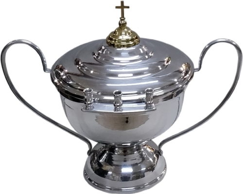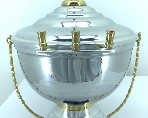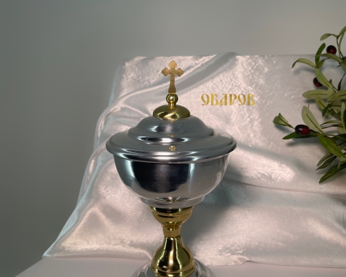 Фигурная алюминиевая водосвятная чаша с крышкой и на ножке. На крышке фигурный крестик. Витая ручка с деревяным держателем.