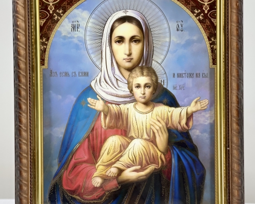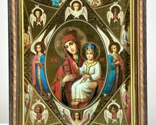 Икона Всецарица на деревянной основе имеет фигурную форму в виде косички, подрамник из пластика с напылением золотистой краски, литография имеет тиснение на бумаге.