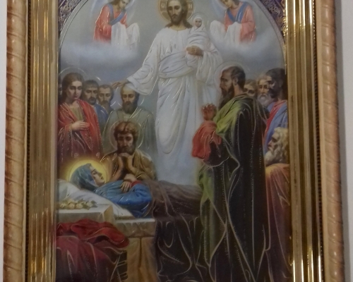 Икона Успения Пресвятой Богородицы на деревянной основе с фигурной формой, напоминающей косички, позолоченным подрамником из пластика и литографией