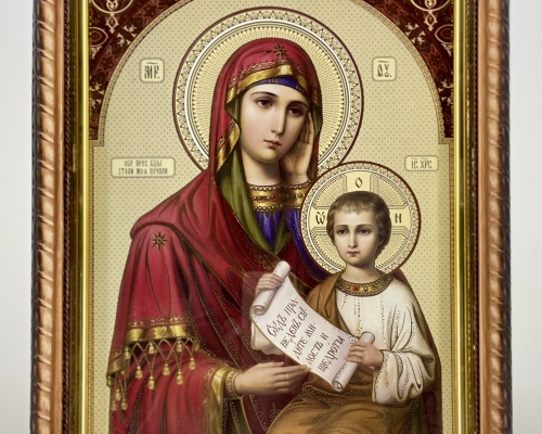 Икона Богородицы "Утали моя печали" на деревянной основе имеет фигурную форму в виде косички, подрамник из пластика с напылением золотистой краски, литография имеет тиснение на бумаге.