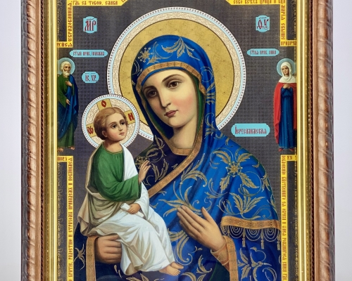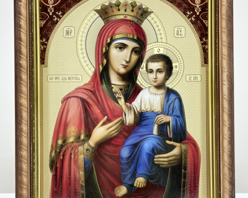 Икона Богородицы "Иверская" на деревянной основе имеет фигурную форму в виде косички, подрамник из пластика с напылением золотистой краски, литография имеет тиснение на бумаге.