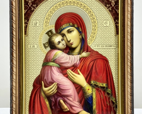 Икона Богородицы "Владимирская" на деревянной основе имеет фигурную форму в виде косички, подрамник из пластика с напылением золотистой краски, литография имеет тиснение на бумаге.