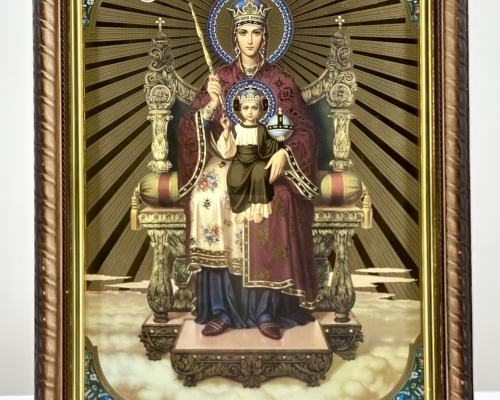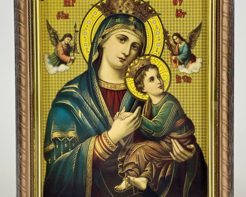 Икона Богородицы "Неустанная Помощь" на деревянной основе с фигурной формой, напоминающей косички, позолоченным подрамником из пластика и литографией