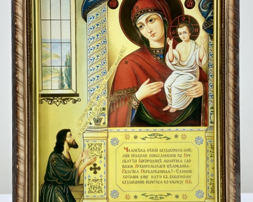 Икона Богородицы "Неожиданная Радость" на деревянной основе имеет фигурную форму в виде косички, подрамник из пластика с напылением золотистой краски, литография имеет тиснение на бумаге.