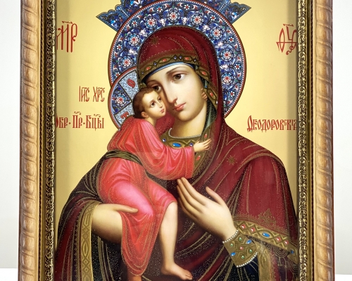 Икона Богородицы "Феодоровская" на деревянной основе имеет фигурную форму в виде косички, подрамник из пластика с напылением золотистой краски, литография имеет тиснение на бумаге.