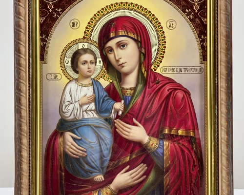 Икона Богородицы "Утали моя печали" на деревянной основе имеет фигурную форму в виде косички, подрамник из пластика с напылением золотистой краски, литография имеет тиснение на бумаге.