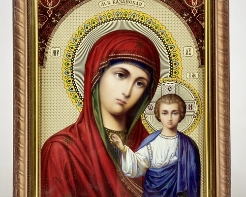 Икона Богородицы "Казанская" на деревянной основе с фигурной формой, напоминающей косички, позолоченным подрамником из пластика и литографией