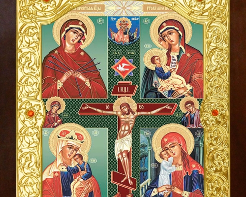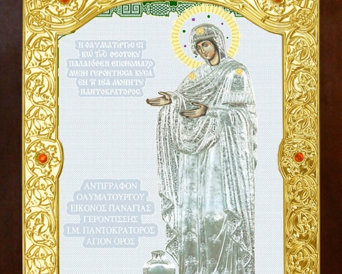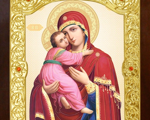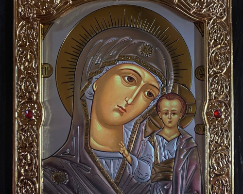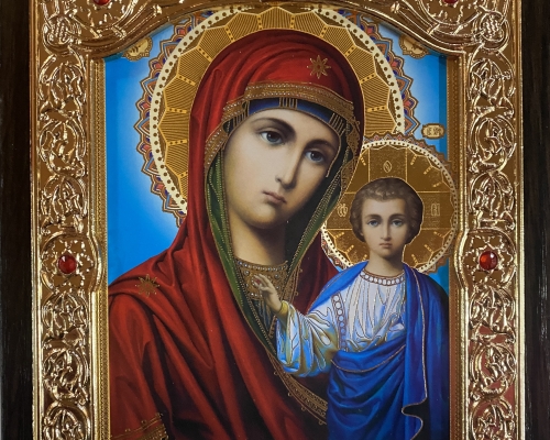 Икона Богородицы: "Остробрамская" рамка изготовлена из высококачественного деревянного основания. Оклад иконы выполнен из пластика с орнаментом, также оклад украшен красными камешками. Печать литографии на бумаге, это позволяет передать детали изображения с большой точностью и яркостью.