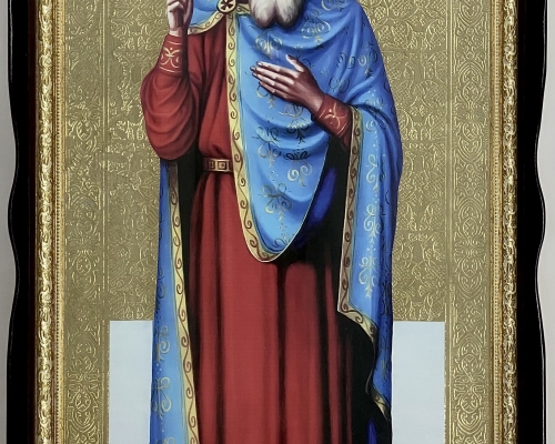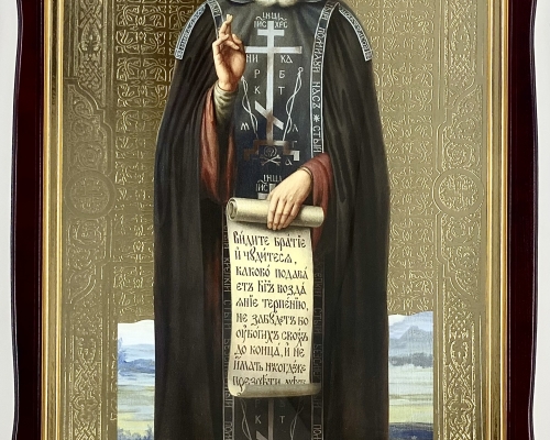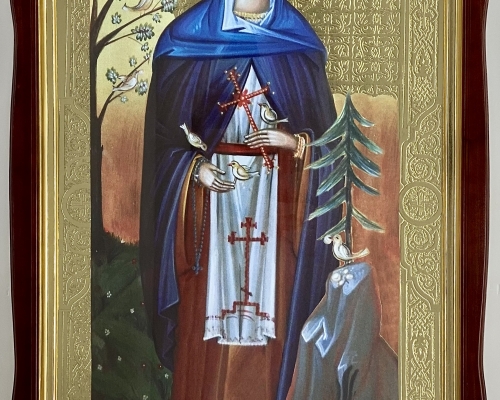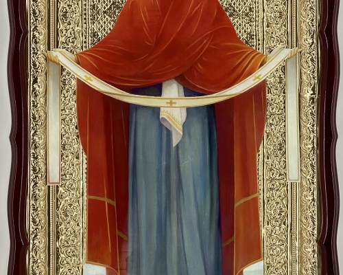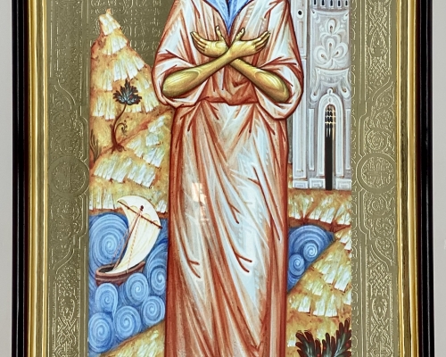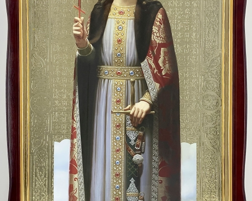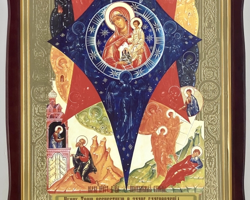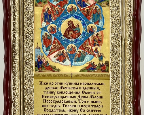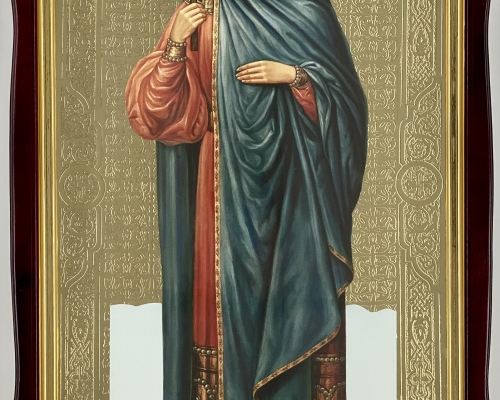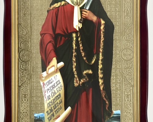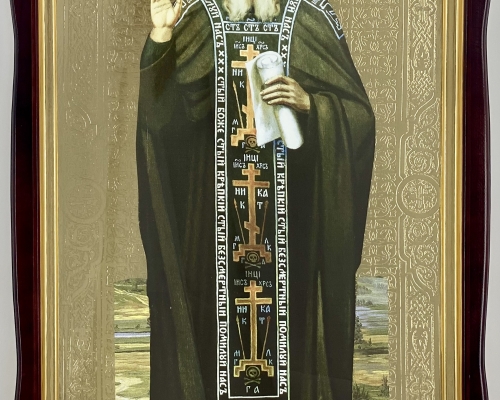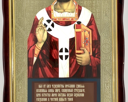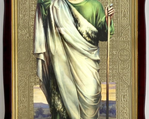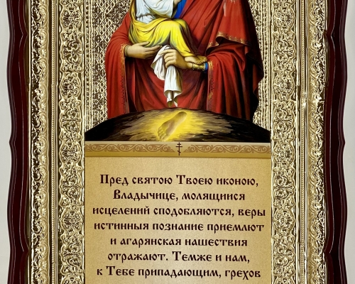 Ікона має дерев’яну рамку з покриттям лаку, що захищає поверхню. Підрамник виготовлений з пластику, та має красивий візерунок з напиленням золотистої фарби, також використовується на деякі елементи кольорова емаль. Літографія друкована на папері