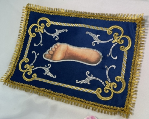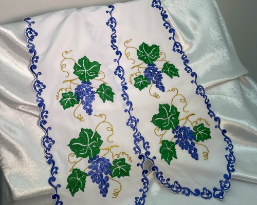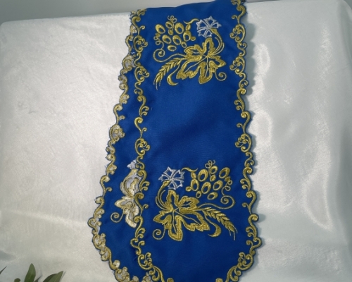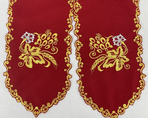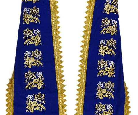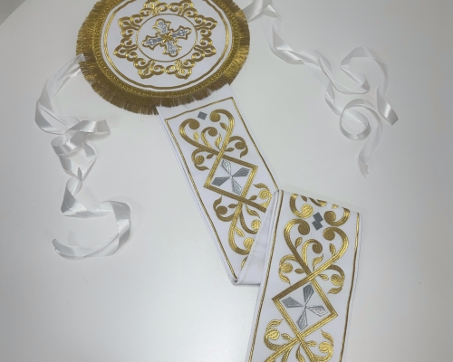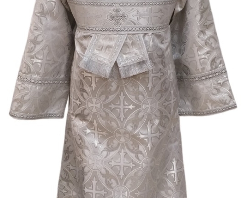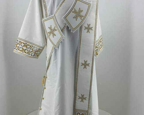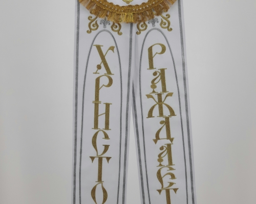 Для пошива стихаря используется качественная парча, главной особенностью являются вышитые рукава и нижняя часть стихаря из бархата, вышивка раскрывается в уникальных узорах, создающих нежный контраст. Орар и поручи изготовлены также из бархата – роскошной ткани с густым ворсом, которая придает текстурной глубины. Благодаря удачному сочетанию ткани и вышивки, стихар выглядит по особому.