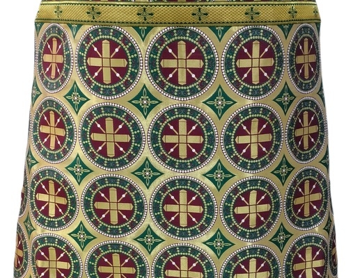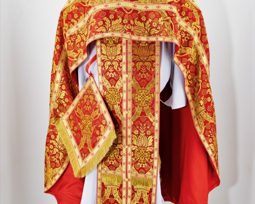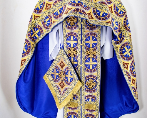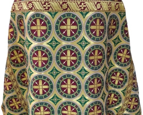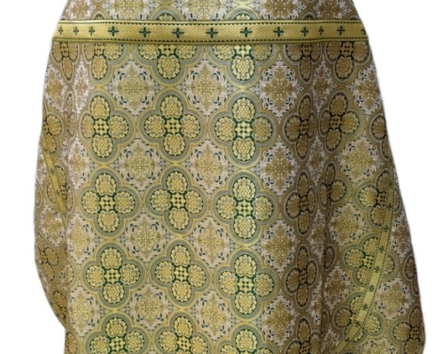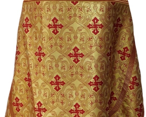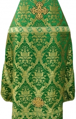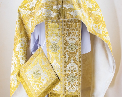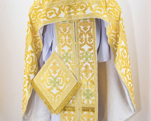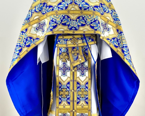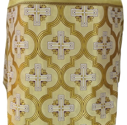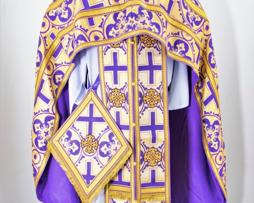облачение священника, сшито из качественной парчовой ткани производства Греция с двойной металлизацией, декорировано крестами, галуном и бахрамой, подклад из креп-сатина. В комплект входит: фелон, епитрахиль, поручи, набедренник, пояс и воздух с покровцами.