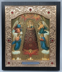 Икона Богородицы: "Невыпиваемая чаша" рамка изготовлена из высококачественного деревянного основания. Оклад иконы выполнен из пластика с орнаментом, также оклад украшен красными камешками. Печать литографии на бумаге, это позволяет передать детали изображения с большой точностью и яркостью.