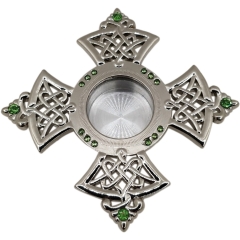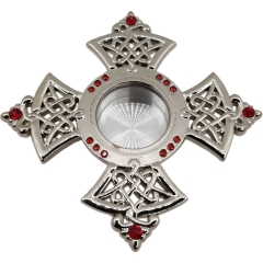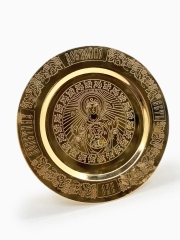 Латунный круглый золотистый мощевик внутри которого вмонтированное стекло. Низ при надобности откручивается.