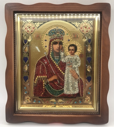 Икона Богородицы "Призраки на смирение" имеет фигурную рамку в виде волны. Подрамник сделан из пластика и покрыт золотистой краской. Литография украшена декоративными камешками и бисером, покрывающимся лаком.