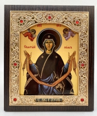Икона Богородицы "Утолы печали" рамка изготовлена из деревянного основания. Оклад иконы выполнен из пластика с орнаментом, также оклад украшен красными камешками. Печать литографии на бумаге позволяет передать детали изображения с большой точностью и яркостью.