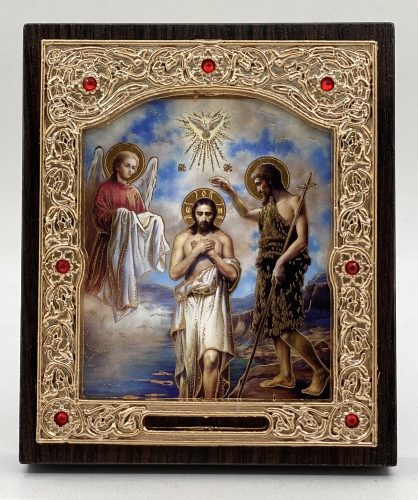 Икона Крещения Господня рамка изготовлена из деревянного основания. Оклад иконы выполнен из пластика с орнаментом, также оклад украшен красными камешками. Печать литографии на бумаге позволяет передать детали изображения с большой точностью и яркостью.