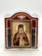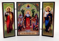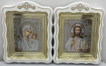 Рамка этой иконы из дерева белого цвета, в форме волны, также рамка имеет напыление искусственной патины золотистого цвета в фигурных вырезах. Подрамник сделан из пластика, окрашен золотистой краской. Литография выполнена на бумаге.