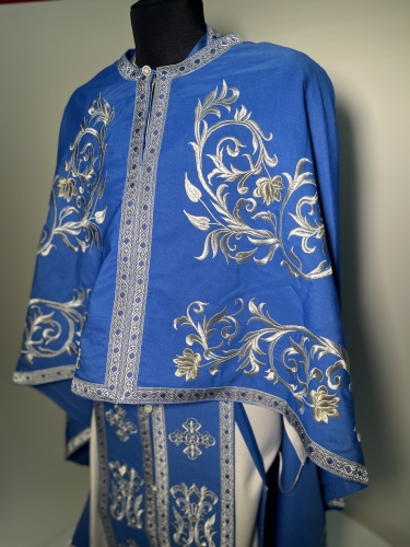 Облачение священника греческий крой, вышитое золотой и серебряной нитью на габардине, декорировано галуном и бахрамой. В комплект входит: фелон, епитрахиль, поручи, палица, набедренник, пояс и воздух с покровцами.