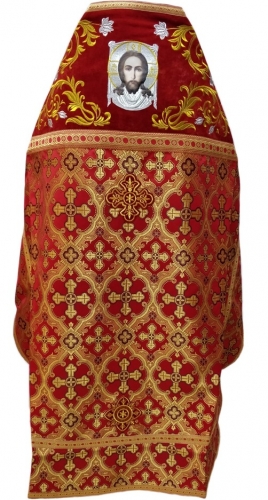 Облачение священника комбинированное, основа из качественной парчовой ткани отечественного производства с двойной металлизацией, верх-вышитый золотой и серебряной нитью на бархате производства Италии, декорирован вышитыми крестами, галуном и бахрамой. В комплект входит: фелон, епитрахиль, поручи, палица, набедренник, пояс и воздух с покровцами.