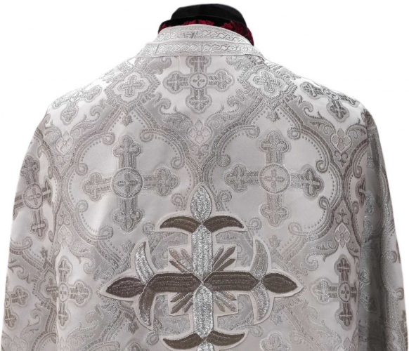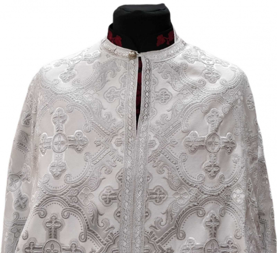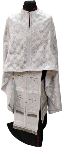Облачение священника греческий крой, сшито из качественной парчовой ткани отечественного производства с двойной металлизацией, декорировано вышитыми крестами, галуном и бахрамой. В комплект входит: фелон, епитрахиль, поручи, палица, набедренник, пояс и воздух с покровцами.