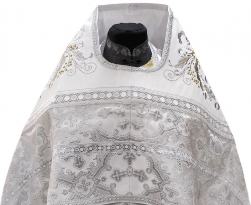 Облачение священника комбинированное, основа из качественной парчовой ткани отечественного производства с двойной металлизацией, верх-вышитый золотой и серебряной нитью на бархате производства Италии, декорирован вышитыми крестами, галуном и бахрамой. В комплект входит: фелон, епитрахиль, поручи, палица, набедренник, пояс и воздух с покровцами.