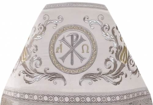 Облачение священника комбинированное, основа из качественной парчовой ткани отечественного производства с двойной металлизацией, верх-вышитый золотой и серебряной нитью на бархатном производстве Италии, декорирован вышитыми крестами, галуном и бахрамой. В комплект входит: фелон, епитрахиль, поручи, палица, набедренник, пояс и воздух с покровцами.