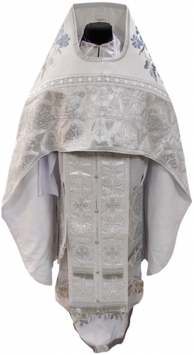 Облачение священника комбинированное, основа из качественной парчовой ткани отечественного производства с двойной металлизацией, верх-вышитый золотой и серебряной нитью на бархате производства Италии, декорирован вышитыми крестами, галуном и бахрамой. В комплект входит: фелон, епитрахиль, поручи, палица, набедренник, пояс и воздух с покровцами.